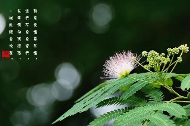 这合欢树最早叫苦情树,也不开花。相传,有个秀才寒窗苦读十年,准备进京赶考。临行时,妻子粉扇指着窗前的那棵苦情树对他说:“夫君此去,必能高中。只是京城乱花迷眼,切莫忘了回家的路!”秀才应诺而去,却从此杳无音信。粉扇在家里盼了又盼,等了又等,青丝变白发,也没等回丈夫的身影。在生命尽头即将到来的时候,粉扇拖着病弱的身体,挣扎着来到那株印证她和丈夫誓言的苦情树前,用生命发下重誓:“如果丈夫变心,从今往后,让这苦情开花,夫为叶,我为花,花不老,叶不落,一生不同心,世世夜欢合!”说罢,气绝身亡。第二年,所有的苦情树果真都开了花,粉柔柔的,像一把把小小的扇子挂满了枝头,还带着一股淡淡地香气,只是花期很短,只有一天。而且,从那时开始,所有的叶子居然也是随着花开花谢来晨展暮合。人们为了纪念粉扇的痴情,也就把苦情树改名为合欢树了。这个故事让人觉着,这合欢树在欢乐的名誉之下所承受的苦难过于沉重,让人不由得觉着分外伤感,觉着这世间的一切美好,其实大都是人们的美好愿景,由凄美的灵魂支撑的希望的形象。