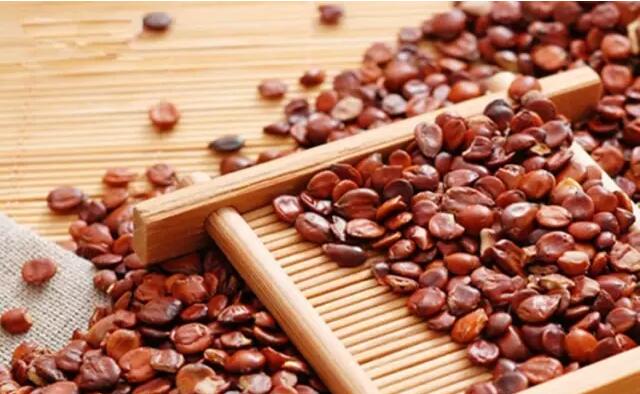 棕褐色,深棕色。呈扁圆形或近椭圆形,长5一gmm,宽5一7mm,厚约为3mm。表面紫红色或枣红色,微有光泽;一面较平坦,中央有一条隆起的线或纵纹,另一面隆起,种子边缘略薄,种皮较软易碎,咀嚼有甜味。