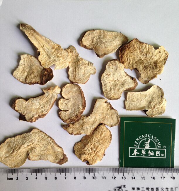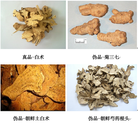 菊科植物白术Atractylodes macrocephala Koidz.的干燥根茎。呈不规则片状,长3-4cm,厚约3mm,表面灰白色或淡黄掠色,粗糙不平,中间有棕色环纹,中心有菊花纹、棕色小点以及破裂空隙。周边外皮灰黄色或灰棕色,有抽缩皱纹,间有弯曲深缺裂,可见有瘤状突起。质坚实。