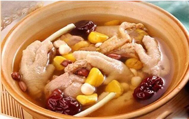原料:白术10克,猪瘦肉100克,炒扁豆25克,火腿肉20克,鸡脚4对,姜片、盐各适量。
