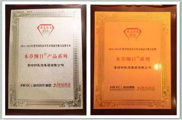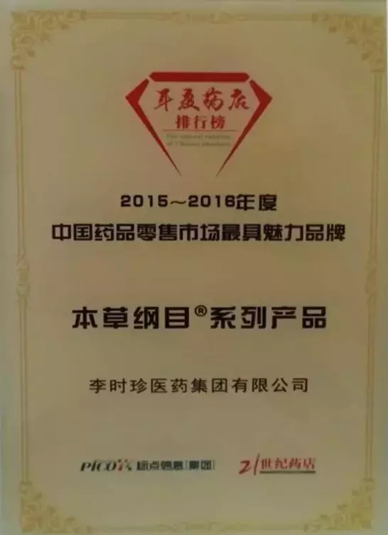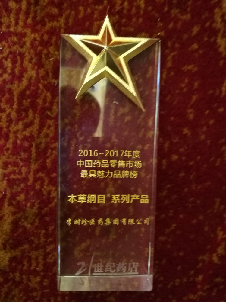 ▲李时珍医药集团本草纲目系列产品荣获2016-2017年度中国药品零售市场最具魅力品牌