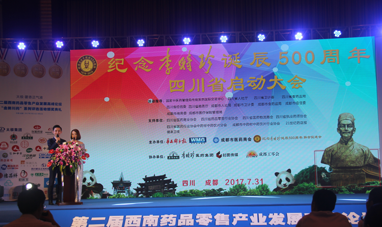 2017年8月1日,由中国药店管理学院、纪念李时珍诞辰500周年联合促进会共同主办,国家中医药管理局传统医药国际交流中心指导的“纪念李时珍诞辰500周年四川省启动仪式”在成都香格里拉大酒店隆重举行。国家中医药管理局、中国药店管理学院全国各分院、全国知名中医馆、全国知名医药连锁、全国知名品牌工业、全国知名中药饮片厂、四川省180家主流医药零售连锁负责人等同仁逾500人参加本次大会。