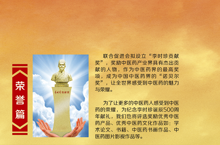 为恭迎这一神圣时刻到来,国家中医药管理局传统医药国际交流中心发起了“纪念李时珍诞辰500周年”联合促进会,希望联合中医药界的官、产、学、研、媒等单位或个人共同参与,并策划开展庆典篇、荣誉篇、传承篇、弘扬篇、传播篇、交流篇、跨界篇、纪念篇、海外篇、延展篇等十大篇章展开系列活动,期望将中医药这颗璀璨的明珠发扬光大,共同缅怀、弘扬李时珍精神,发展中医药文化,繁荣大健康产业。