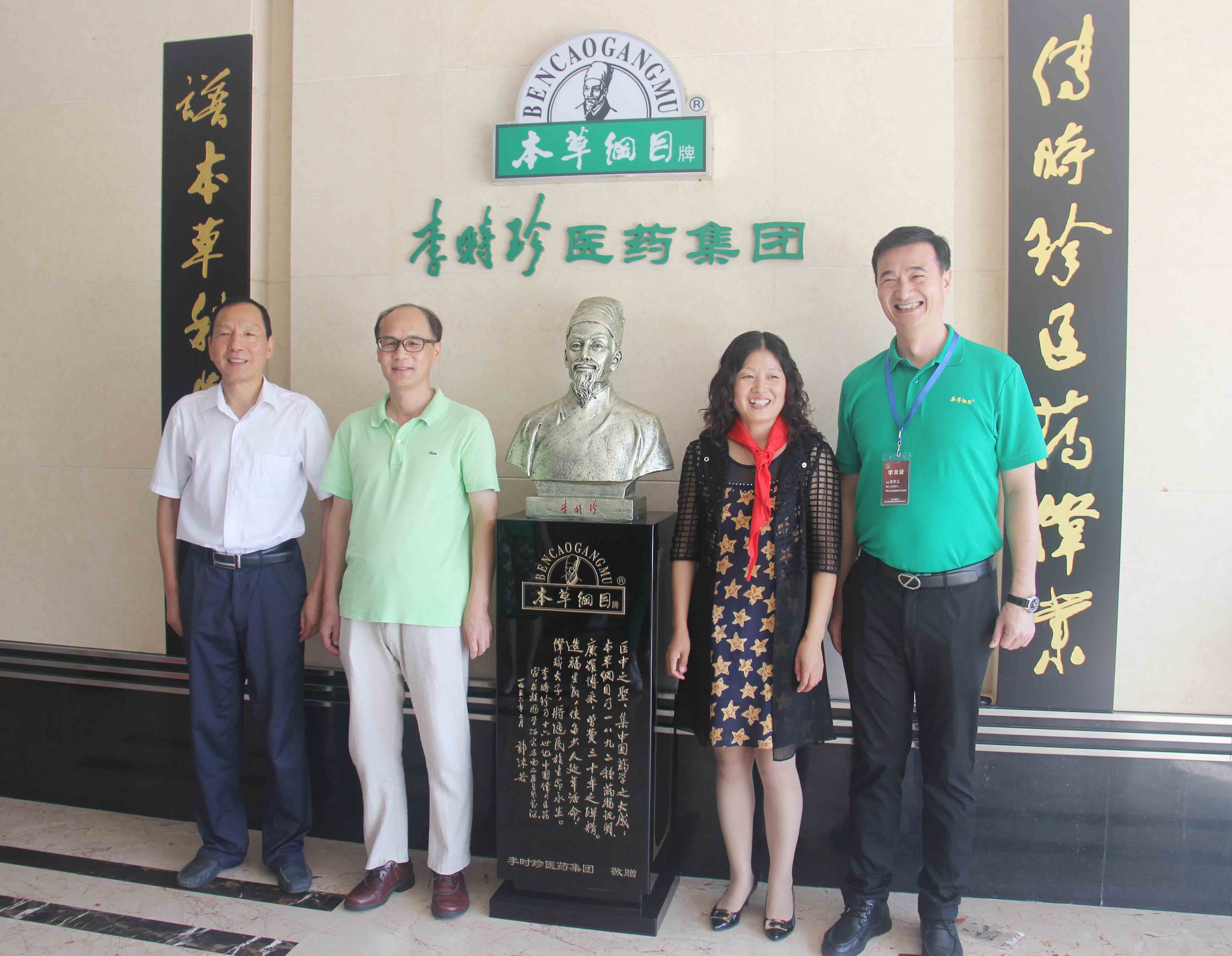 ▲原厦门市市场监督管理局副巡视员朱建新(左一)、国家中医药管理局传统医药国际交流中心项目管理处负责人郑亚峰(左二)、天津中医药大学李桂平教授(右二)、李时珍医药集团首席品牌官杨明江(右一)