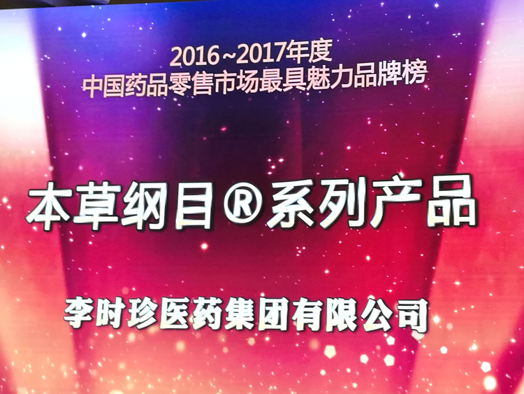 ▲李时珍医药集团本草纲目系列产品荣获2016-2017年度中国药品零售市场最具魅力品牌