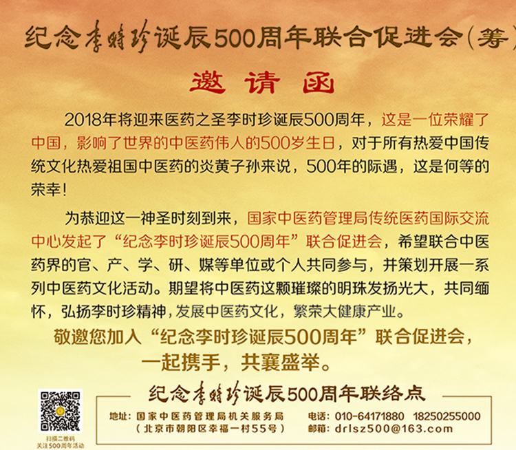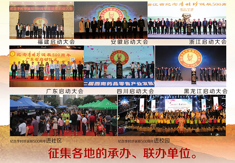 为恭迎这一神圣时刻到来,国家中医药管理局传统医药国际交流中心发起了“纪念李时珍诞辰500周年”联合促进会,希望联合中医药界的官、产、学、研、媒等单位或个人共同参与,并策划开展庆典篇、荣誉篇、传承篇、弘扬篇、传播篇、交流篇、跨界篇、纪念篇、海外篇、延展篇等十大篇章展开系列活动,期望将中医药这颗璀璨的明珠发扬光大,共同缅怀、弘扬李时珍精神,发展中医药文化,繁荣大健康产业。