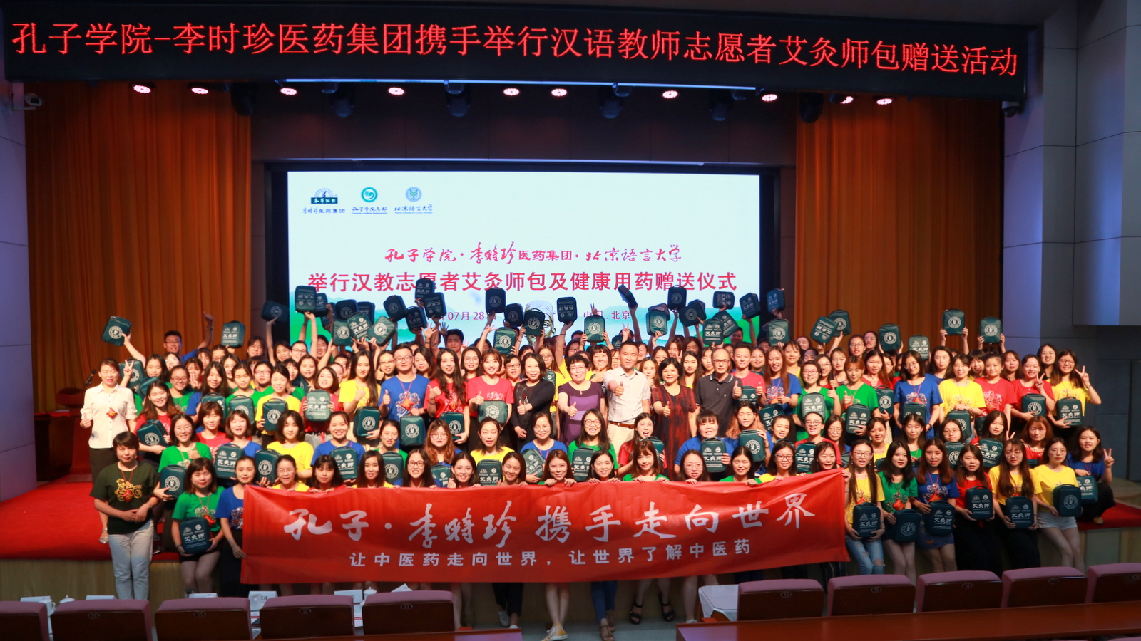 2018年7月24日至28日,在国家中医药管理局传统医药国际交流中心指导下,孔子学院总部/国家汉办、李时珍医药集团联合主办了“汉教志愿者艾灸师包及健康用药赠送活动”。活动相继在厦门大学、福州师范大学、云南师范大学,北京师范大学,重庆师范大学,北京外国语大学,北京语言大学,新疆师范大学举办并圆满落幕。国家中医药管理局传统医药国际交流中心项目管理处负责人郑亚峰,孔子学院总部志愿者工作处处长郭骄阳,中国生命关怀协会理事、医促委副秘书长、新华社半月谈卫生健康主任李占平,北京师范大学汉语文化学院执行院长朱瑞平教授,北京语言大学孔子学院事业部主任陈丽霞,李时珍医药集团培训学院院长黄海龙等嘉宾出席活动。新华社、人民日报民生周刊等多家媒体对此次活动进行了专题报到。